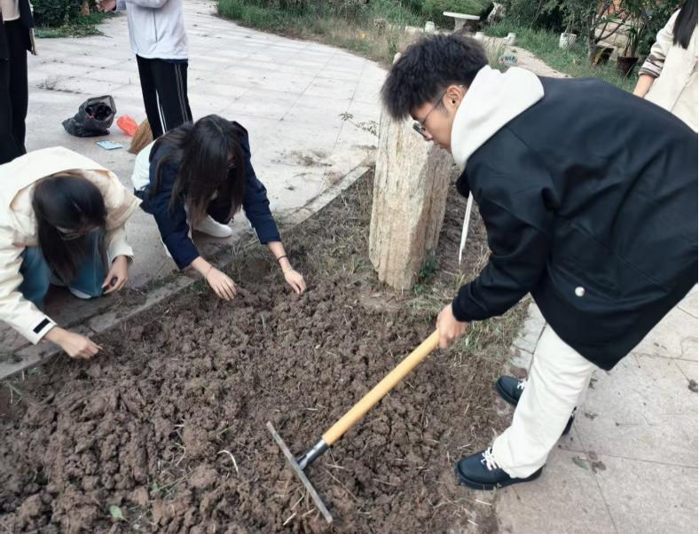 本次活动分两阶段开展。19日,学生们手持镰刀、铁锨、耙子等农具除草、翻地。面对略显板结的土壤,男生主动承担起深翻的重任,挥动铁锨,将沉睡的泥土唤醒。女生则用耙子细心地将大块的土坷垃敲碎、耙平。隔日进行播种,学生各自选择喜欢的植物种子,挖坑、播种、填土、施肥。杂草清理一空,散落的土块也收拾得干干净净,一片松软平整的田地播种下了新的希望。望着共同的劳动成果,大家脸上都洋溢着满足与自豪,纷纷表示期待新生命的萌发。